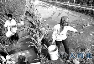 8月27日,靖远县东湾镇三合村村民黑维燕(右)用水桶给自家被黄河水浸泡的蔬菜大棚排水。
