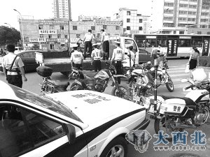 昨日上午,雁滩交警大队在新港城设卡点,对过往摩托车进行排查。9时15分许,民警发现一辆挂着“甘A-4509X”的摩托车向卡点驶了过来。经查该摩托车司机提供不出驾驶证和行车证,交警遂将摩托车暂扣。9时20分许,一名男子驾驶一辆摩托车从雁北路鸿运润园向西驶来,快到十字路口时,该男子看到在此设卡的交警立即调头,一名交警迅速将其拦下。经查,该摩托车司机不能提供车辆的合法手续,交警将该车扣留。从29日开始,两天共查获违法摩托车近30辆。