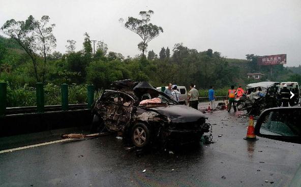 成渝高速资中段发生车祸,一辆逆向车道上的黑色小轿车,突然撞开隔离栏,撞向面包车,导致7名亲人5死2伤,遇难人员中包括一名儿童。