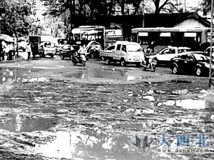 前几日大雨后,记者路过三角花园看见,大坑小坑全变成了泥水坑,公交车进站以后,就连公交车司机也皱着眉头。17路公交车司机张师傅告诉记者:“这个地方一直就是这个样子,也没人管,一到下雨,这儿的路真是没法走,我们停车想停个干净点的地方让乘客下车都找不到。一到下雨,大坑小坑的泥水经常会被过往车辆无意溅到路旁行人身上。”一到下雨天,人远远的躲着车走,这也成了三角花园的一道“风景线”。也因为这样的路况,很多出租车司机加完气之后宁愿不拉顾客绕走南山路也不走公交调度站前的路,弄的附近居民下雨天想出行更是难上加难。