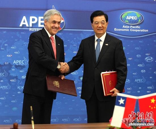 中国国家主席胡锦涛当地时间9月9日上午在俄罗斯符拉迪沃斯托克和智利总统皮涅拉共同出席《中智自由贸易协定关于投资的补充协定》签字仪式。中新社发张朔摄