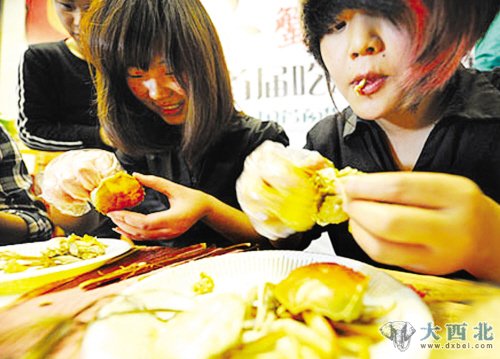 现场第一轮参加品蟹的选手帅哥多,9位选手一字排开,面前摆着外地运来的精品螃蟹。“千万别以为品蟹很轻松,他们可要在5分钟里将一只蟹干净地吃掉,并完美复原。”主持人的一句话将现场气氛引燃。“加油!加油!”别看帅哥们开始都文质彬彬,可到了品尝美食的关键时刻一点都不含糊。他们有的先掰开蟹壳,呼哧呼哧吮食蟹黄;有的则是先把蟹爪全部折下,最后才品尝蟹黄。