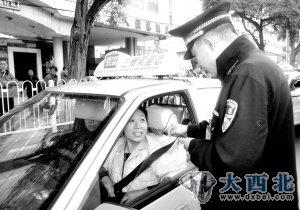 上午10时许,记者又来到汽车东站整治点。据城市道路运输管理处办公室副主任张新龙介绍,根据已经检查的结果来看,出租车存在的比较普遍的问题是无上岗证、无监督卡、无CNG证以及无工服。他说:“对于无证现象,将会给予一定的处罚。”随后,一位没有上岗证、监督卡以及CNG证的出租车被民警拦停。因为没有这几种证件,民警对其下达了《道路运输违章通知书》,该驾驶员还受到了处罚200元钱的罚款处置。