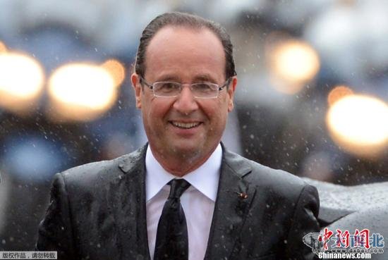 当地时间2012年5月15日,法国巴黎,法国总统奥朗德参加总统权力交接仪式后,冒雨赴凯旋门向阵亡无名英雄墓敬献花圈。