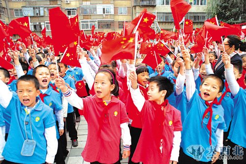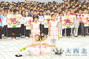 鑫报讯 昨日,兰州市一只船小学举办了“庆国庆”经典诵读活动。活动主题为“雅言传承文明,经典浸润人生”,两千多名师生一起,通过共同吟诵国学经典,以这种特殊的方式庆祝新中国华诞63周年。