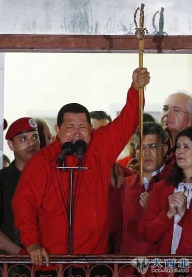 当地时间7日,大选胜利后,查韦斯手持原属拉美民族英雄玻利瓦尔的剑出现在总统府阳台。