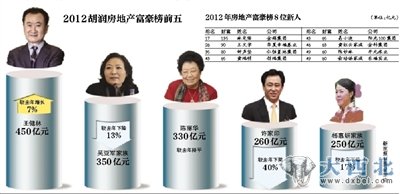 新京报讯 在昨日发布的《2012胡润房地产富豪榜》上,万达董事长王健林以财富450亿元成为榜单首富,吴亚军家族以财富350亿元排名第二位,比去年减少50亿元。今年,上榜富豪财富平均缩水5%,比五年前时财富下降17.4%。
