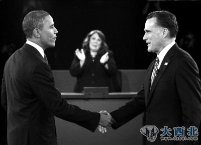 16日,奥巴马与罗姆尼在第二场辩论开始前握手。图/东方IC