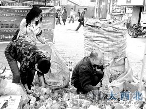 10月23日,捡瓶子救老师行动在西北师大校园内正式启动,记者在师大兰天学生公寓门口看到,蓝天疾控协会的成员已经收集了一大堆饮料瓶,几名学生正在热情地接过其他学生们送来的瓶子。师大经济学院大二学生、蓝天疾控协会负责人李勇介绍,协会不止在兰天公寓设立了瓶子收集点,在学校内部的一些地段也设立了收集点。