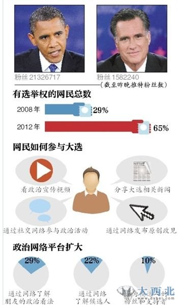 他们都使用新媒体和网络来吸引民众,让民众认为他们在时刻关心着舆情动态和社会最新情况。让选民认为他们会时刻参与大选进程中。而2008年奥巴马以压倒性优势胜利也可以说是新媒体和网络作用巨大,他会利用选民自己的动向来吸引更多的选民支持他。 ——艾米·米歇尔(一名新闻系主任)