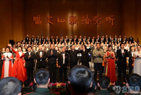 出席音乐会的领导与全体演员、观众齐声高唱《没有共产党就没有新中国》。 贾笑云 摄