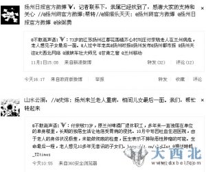 昨日上午,记者在新浪微博中发布了一个#病危老人寻子女#的话题,并链接了发表在当日《鑫报》上的《与亲人失去联系十余载 扬州重病老人想见儿女最后一面》的地址,一时在网上引起了热转,很多热心网友在微博中留言,表示为老人的病情担心,希望能够提供线索帮助老人找到子女。但是在没有任何联系方式的情况下,想要找到老人已经失去联系十多年的子女,真如大海捞针。
