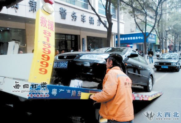 每日甘肃网-兰州晨报讯(首席记者裴强 通讯员李晓东)劝离、发放温馨提示卡、拖离……经过城关区交警大队大力整治后,车辆路边乱停放的现象得到了有效改观,然而,部分甘O车、军车依然我行我素,在摆放了禁止停车的锥形警示桶旁乱停放。11月19日上午,一辆未悬挂后牌的甘O车在武都路乱停放时,被交警依法拖离了现场。当日,城关交警大队共依法拖离了4辆乱停放的军车、甘O车。