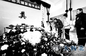 美丽新娘李成环”的横幅下,是李成环老师的遗像,照片中的她是那样年轻漂亮、神采依旧,宛若平日;会场中央,这位生命时钟永远停在25岁的年轻姑娘,静静地躺在灵柩内,面容安详,好像只是在熟睡。素雅的菊丛围绕在她的遗体四周。