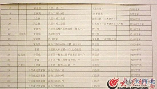 帖子里附着的“个人房地产登记情况明细”还显示于保成30多套房产的相关情况,包括登记房主名字、房产所在地址、用途、建筑面积等,都清晰可见。