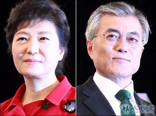 12月16日,韩国总统候选人朴槿惠(图左)与文在寅出席大选前最后一次电视辩论。