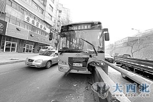 鑫报讯 1月9日8时15分,一辆302路公交车行驶至解放门马家坡立交桥附近时,突然失控车头撞在立交桥的护栏上,并造成交通堵塞,十多名乘客不同程度的受伤,其中4名乘客还在检查治疗中。