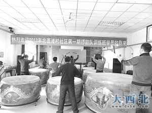 鑫报讯 昨日,兰州市北面滩村社区内,锣鼓喧天、铜镲震耳,一片喜庆之声。为迎接新春佳节,2013年北面滩村社区第一期锣鼓队训练班,在社区广场前正式开班。