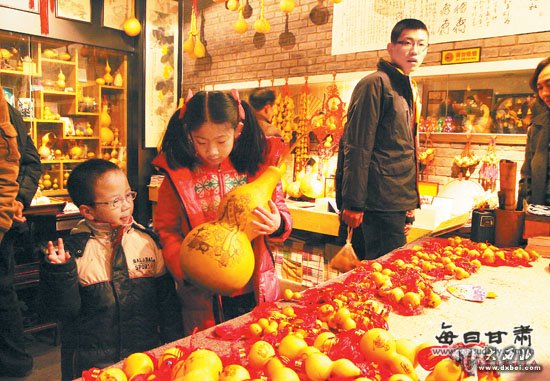 2月12日,市民在兰州金城关文化风情园欣赏葫芦雕刻工艺品。当日,在兰州市第十一届春节文化庙会上,葫芦雕刻、剪纸等丰富多彩的传统民俗展演,吸引了大批市民和游人前来赏民俗。