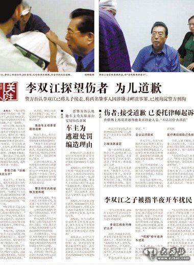 9月8日,李双江到医院探望被打夫妇,为儿子道歉,称“没有教育好儿子,我宁愿你们用棍子把我打一顿。”