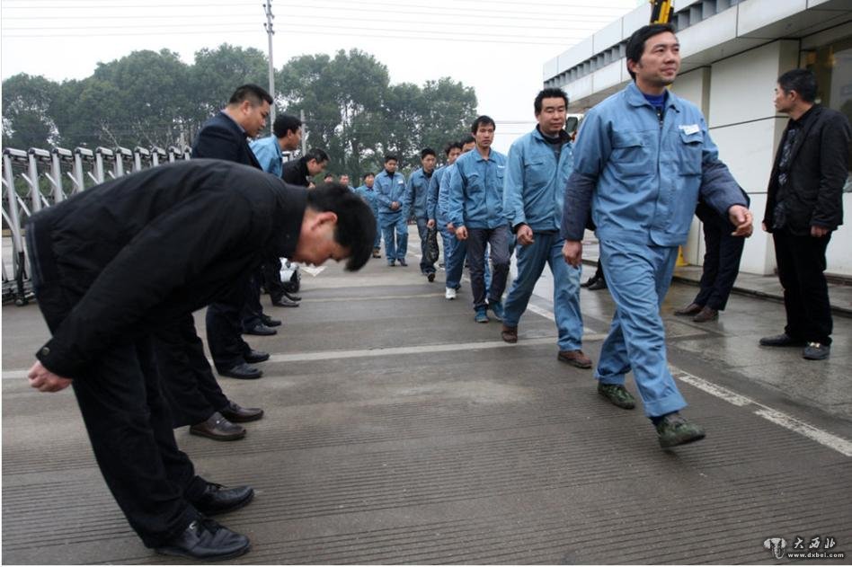 2013年2月25日,元宵节后的上班第一天,浙江台州一企业的高管们在厂区门口以列队鞠躬的方式欢迎员工返厂上班。图片来源:饭哥/CFP
