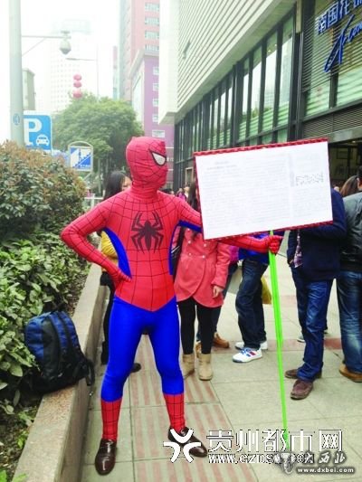 见习记者 班亚 摄影报道 本报讯 昨日下午,郭先生致电本报24小时新闻热线96811,称在贵阳喷水池南国花锦大厦门口有一“蜘蛛侠”,左手举着一牌子,写着要用一张在2013年1月4日购买的特殊彩票[微博](彩票号为5201314)向慈善家陈光标先生换取100万元人民币。