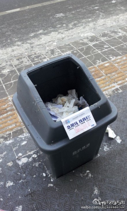 兰州城关区武都路一牛肉面馆门口的垃圾箱上贴了“用钱”小广告,贴广告的人真算找对地方了。 (责任编辑:张云文)