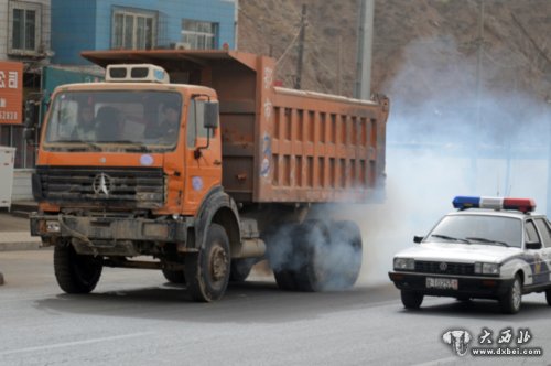 昨日上午10时许,在雁滩桥卡口点执勤的河北交警大队民警正在指挥过往车辆。这时,一辆超大翻斗车急速行驶而来,车后的尘土如狂风一样尾随着货车一路席卷而来。因为该车属禁行车辆,民警遂立即驱车追赶该车并将其拦停,打算劝返。熟料,当大货车停下后,民警惊奇地发现,该车居然没有悬挂号牌。而且,挂号牌的保险杠已经面目全非,整个车身已经伤痕累累。