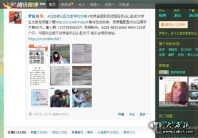 终于,腾讯微博上的爱心人士“罗佰川”(百川公益志愿者协会创始人),将董小霞的事迹通过#贫困山区支教孕妇求助#的话题在腾讯微博上进行发布,截止目前,这条微博阅读量达到445万,转播量已经达到11036次,评论1200次。