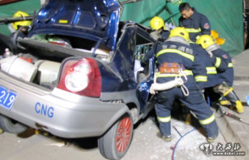 昨日早晨5时46分,一阵急促的电铃声惊醒了东岗消防中队熟睡的官兵。东岗消防中队接到群众报警,城关区甘南路兰海商贸城门口一辆出租车撞上路边电线杆,车内两人被困,情况万分紧急,请求消防官兵营救。接到报警后,东岗消防中队迅速出动12名官兵、1辆抢险救援车1辆7吨水罐车火速赶赴事故现场。