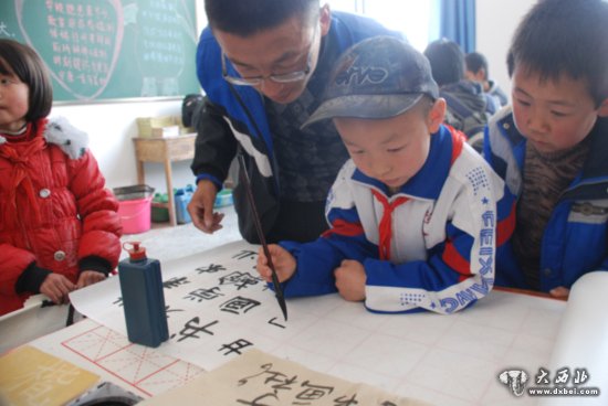 “我爱拍照,喜欢写毛笔字,但是我必须先拍个照片才能和你学书法。”啃着鸡腿的三年级杨成哼哼着往镜头里挤,翰墨书画社的志愿者拽都拽不住。杨成吃的鸡腿,正是甘肃省政府实施的农村义务教育学生营养改善计划,孩子们人手一份,每天3元的营养餐补助,让孩子们告别了吃冷馍、喝凉水的苦日子。乒乓球协会、羽毛球协会的志愿者带着简易工具,对乒乓球案进行维修,并且建设了一个简单但温馨的羽毛球场地。12点放学,在校住宿的同学们迫不及待的吃完午饭,挤到乒乓球、羽毛球场地,都想感受一下“新”的体育设施。和杨成一个班的两对双胞胎小姑娘,回家吃完饭就跑到了学校,找哥哥姐姐们玩耍。志愿者们便把同学们分为几个小组,手把手的教孩子们打球的基本动作,同学们学的认真,一板一眼、有模有样。