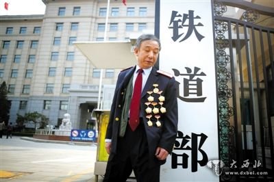3月14日,铁道部大门口,一位胸前挂着多枚勋章的铁道部老职工与铁道部牌子合影。 侯少卿 摄
