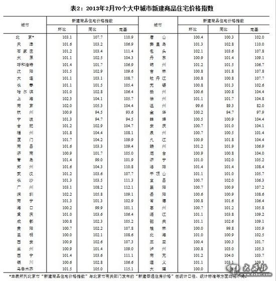 中新网3月18日电 国家统计局今天上午发布的2013年2月份70个大中城市住宅销售价格变动情况显示,新建商品住宅(不含保障性住房)价格变动情况方面,与上月相比,价格下降的城市有1个,持平的城市有3个,上涨的城市有66个。环比价格上涨的城市中,最高涨幅为3.1%。其中,北京、广州上涨3.1%,涨幅居首;上海上涨2.3%,深圳上涨2.2%紧随其后。