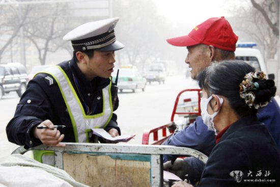 几分钟后,他们来到整治点,看到有禁行的三轮车,几名协警遂上前将其拦停并开具了罚单。看到一位老人不解的表情,协警马文龙给老人详细地做了解释。随后,他告诉老人去哪儿交罚款,去哪儿取车以及怎么走。当老人弄明白这些情况要走时,马文龙还不忘告诉老人:“您以后再不要骑这车进城了,不然又会被查扣的。再者,您年纪了大了,不安全。”