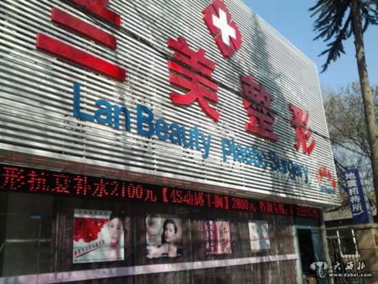 兰州盘旋路东侧约400米处北面的一家二层楼面上,兰美整形四个红色大字十分醒目。医院墙壁使用整块大玻璃镶冾,从外面就可看到里面淡雅的窗帘。走进里面木地板面整洁,白色墙壁上悬挂着女士整形的部位显示图,靠玻璃墙边一侧摆放着几个圆桌,上面的花束鲜艳清香。