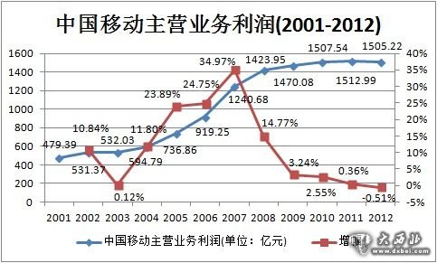 这是中国移动近10年来首次主营业务净利润同比下滑。财报显示,尽管中国移动全年纯利仍增长2.7%至1292.7亿元,但单计电讯业务的税前营业利润为1505.2亿元,较2011年倒退了0.5%,较2004至2006年时的双位数增长不可同日而语。