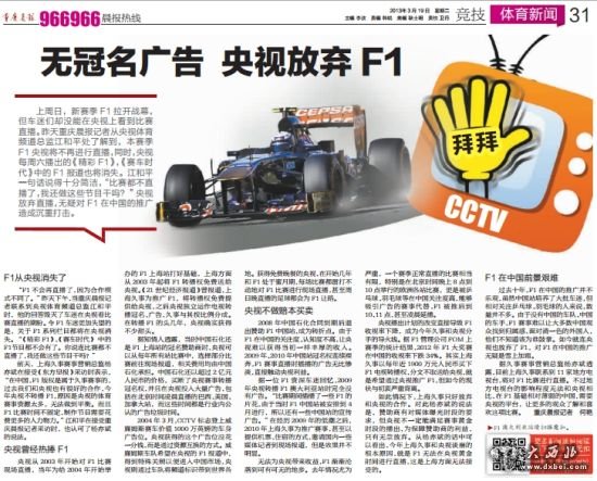 央视不做赔本买卖2008年中国石化合同到期后退出赞助F1中国站,成为转折点。由于F1在中国的关注度、认知度不高,让央视难以获得当初一样丰厚的收入。2009年、2010年中国站冠名权连续裸奔,F1赛事直播时插播的广告无比惨淡,直接触动央视利益。