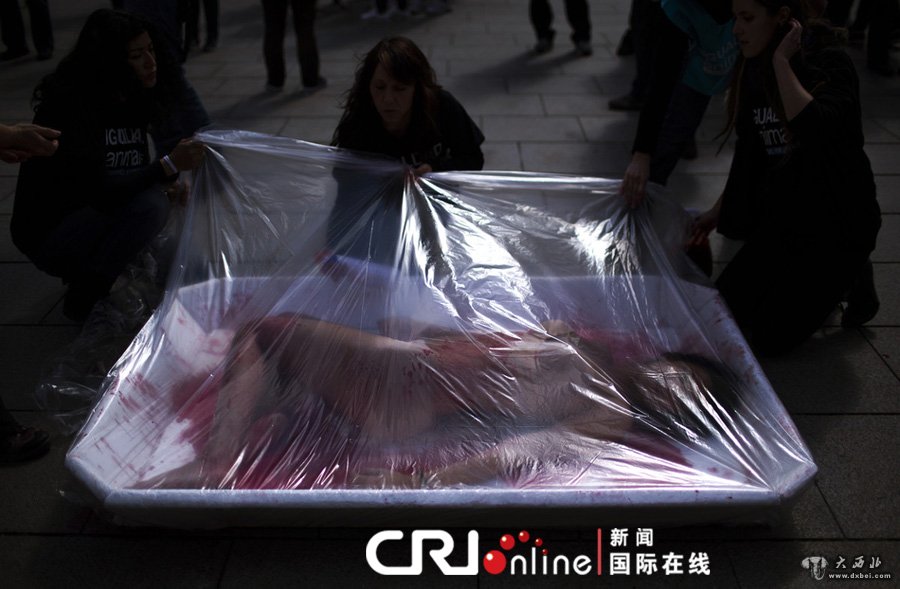 当地时间2月3日,墨西哥首都墨西哥城,动物保护组织志愿者街头半裸抗议,抵制斗牛。