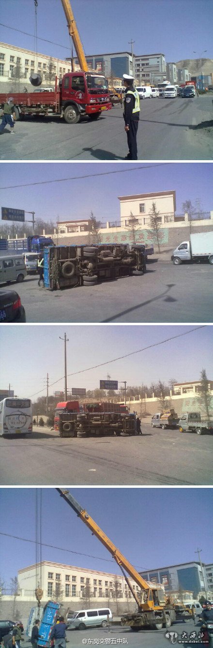大西北网快讯 据东岗交警微博消息:2013年3月21日下午13时许,一辆大货车行驶至东岗立交桥“金崖路口”时,由于转弯车速太快造成侧翻,车上装载的货物散落一地,所幸没有造成人员伤亡。