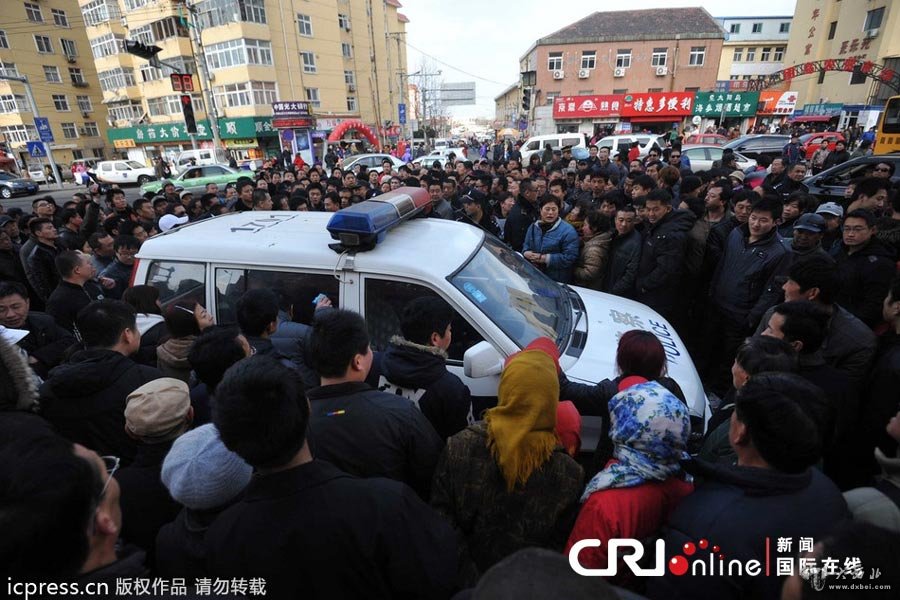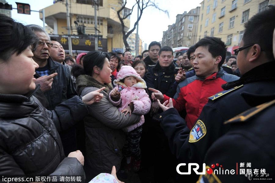 众人围观城管队员(注:中间配黄色肩章的制服人员)。图片来源:宋新华/东方IC