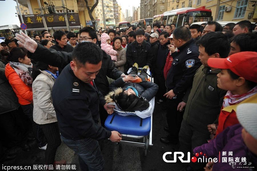 一名受伤女业主被拉走。图片来源:宋新华/东方IC