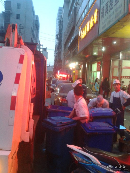 7时30分,车辆来到大众巷中部偏北区域,车辆停下后,依然引来数家餐馆服务员的迎接,年轻力壮的小伙子们,快速而又利索地将一桶桶垃圾倾倒在车内。约8分钟后,车辆启动,准备继续向北行驶,而就在此时,一家餐馆的老板拦着司机喊:“老兄!等一等!还有呢!”听到提醒,司机又停下来,拦车的老板笑着说:“你以后来时,提前通知我们一下,我们好准备一下,餐厨垃圾多着呢!”