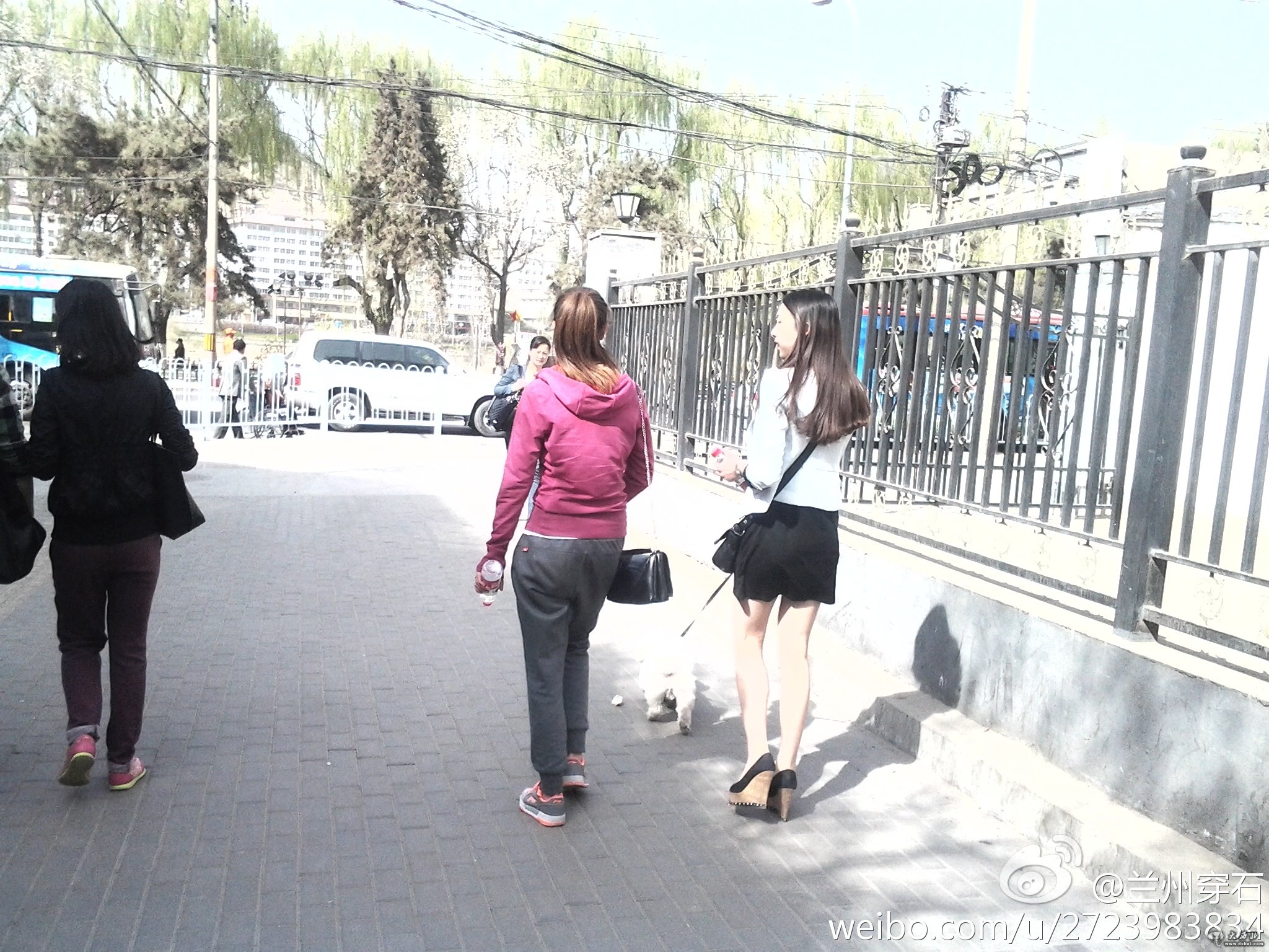 3月27日兰州气温达到22度,下午明媚的阳光照射在大街小巷,人们纷纷出门享受春天的快乐。大街上两个美女边走边聊,其中一位美女裸腿牵着小狗。 (责任编辑:鑫报)