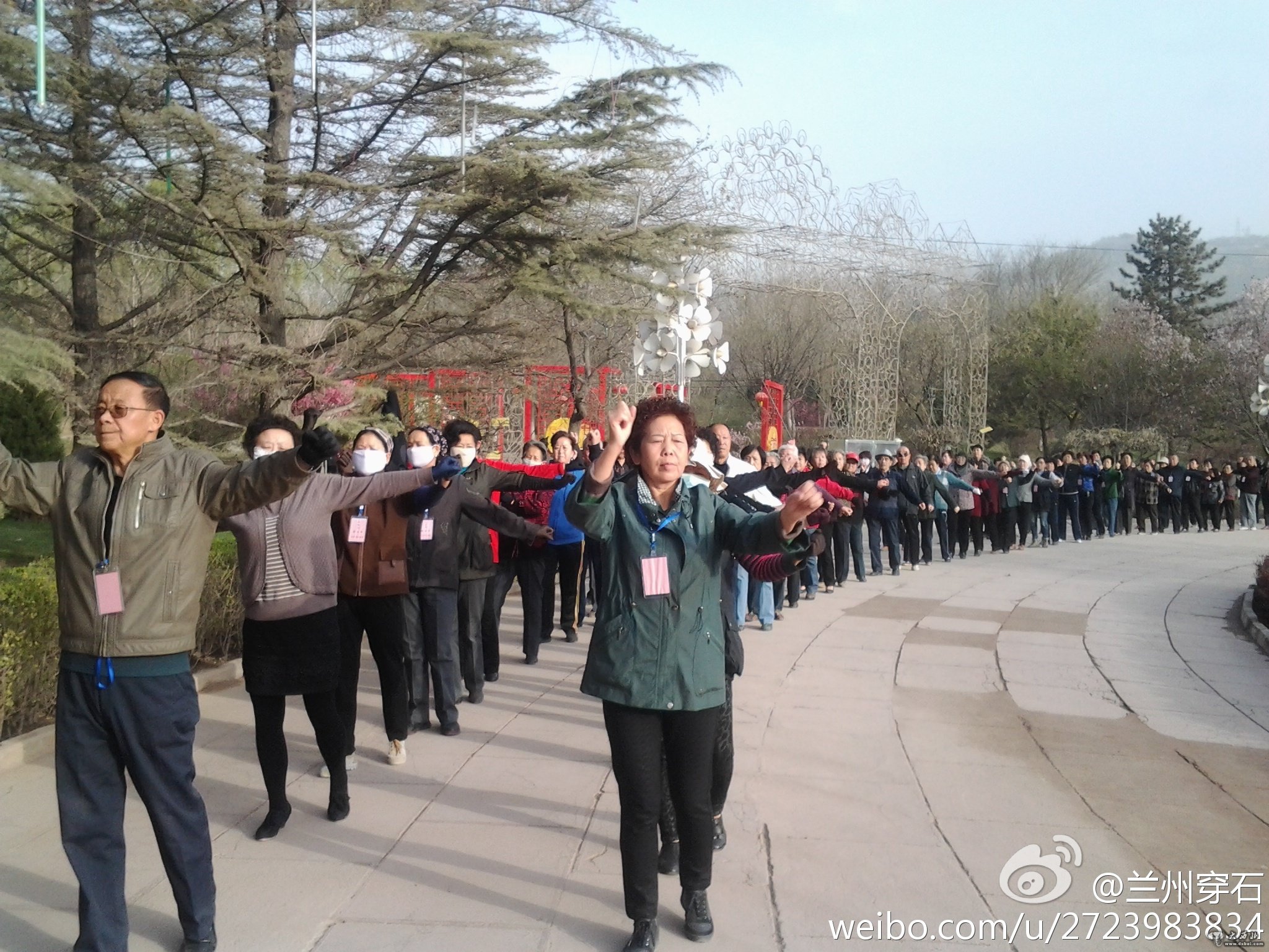 几百名人们排成整齐的两人双队,慢慢沿着兰州小西湖公园内的圆圈行走,时而双手摆动时而扭动腰肢。参加徒步操的多数是老人,每个人身上戴着健美操小方牌。一位老人讲徒步健美操速度不快,很适合老人锻炼身体。 (责任编辑:鑫报)