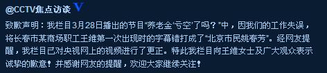 焦点访谈: 致歉声明:我栏目3月28日播出的节目“养老金‘亏空’了吗?”中,因我们的工作失误,将长春市某商场职工王维第一次出现时的字幕错打成了“北京市民姚春芳”。经网友提醒,我栏目已对央视网上的视频进行了更正。特此我栏目向王维女士及广大观众表示诚挚的歉意!并感谢网友的提醒,欢迎大家继续关注!