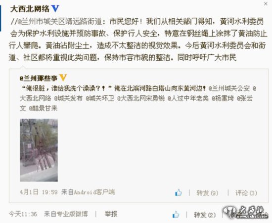 鑫报讯 4月1日,本报记者通过自己的新浪个人微博,以图片和文字的形式发布了北滨河路白塔山向东黄河边一跨河索引缆绳油污“缠身”,污浊不堪的画面。此微博一经发布就引起了社会广泛关注,昨日,新浪微博@兰州市城关区靖远路街道及时作出回馈,并给出相应的解决措施。像这样的“民生”问题,靖远路街道已经为辖区范围内解决了很多个。