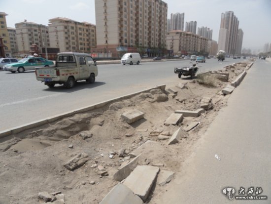 昨日上午,记者在兰州市雁北路北面滩段看到,宽敞笔挺的道路中间,绿化带设施一片狼藉,作为雁滩北部主干道上的绿化带,不但难觅绿化的影子,而且已经建成的基础设施也难以保存。