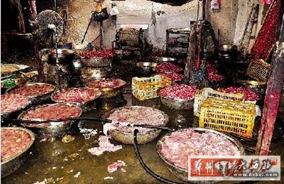 一名工人说,厂方对外称是从北环长兴路口水产大世界购买的原材料,实际上买的是别人偷偷送来的病死的猪肉、鸡肉。