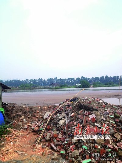 建筑垃圾被倒入鱼塘。
