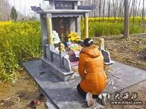 吴晓雅跪在丈夫的墓前哭诉,墓碑是以他们儿子的名义立的。